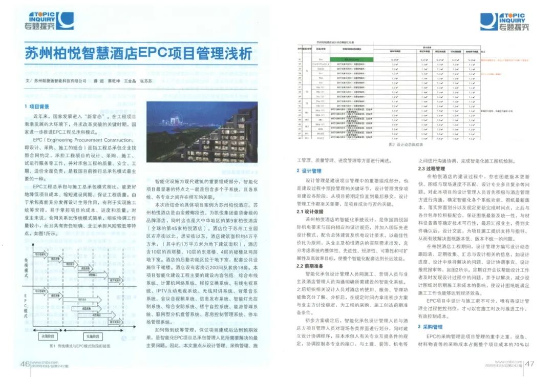 如何將各專業(yè)統(tǒng)籌合理管理,保證項(xiàng)目建成后達(dá)到預(yù)期效果,是智能化EPC項(xiàng)目總承包管理人員所需要解決的最主要問題。因此,本文重點(diǎn)從設(shè)計(jì)管理,采購管理,施工管理,質(zhì)量管理,進(jìn)度管理進(jìn)行闡述。蘇州柏悅酒店的智能化系統(tǒng)設(shè)計(jì),是依據(jù)凱悅國際機(jī)電要求與國內(nèi)各專業(yè)的設(shè)計(jì)規(guī)范,并加入國際先進(jìn)設(shè)計(jì)模式,配合總體建筑及機(jī)電設(shè)計(jì)要求,以最佳性價(jià)比為原則,從業(yè)主及柏悅酒店的實(shí)際需求出發(fā),充分考慮系統(tǒng)的整體性、先進(jìn)性、經(jīng)濟(jì)性、可靠性和可擴(kuò)展性及高效率目標(biāo),令整個(gè)智能化配套達(dá)到長遠(yuǎn)效益。智能化承包設(shè)計(jì)管理人員同施工、營銷人員與業(yè)主及酒店管理人員溝通明確所需建設(shè)的智能化系統(tǒng)。之后組織相關(guān)設(shè)計(jì)人員對酒店的使用、服務(wù)、管理功能做充分了解、分析后,在規(guī)定時(shí)間內(nèi)拿出初步方案與業(yè)主方討論確定,為工程的采購、施工創(chuàng)造前期準(zhǔn)備條件。初步方案確定后,智能化承包設(shè)計(jì)管理人員與酒店方項(xiàng)目管理人員對現(xiàn)場各類界面進(jìn)行劃分,同時(shí)建立設(shè)計(jì)協(xié)調(diào)程序,按本承包人有關(guān)專業(yè)互提條件的規(guī)定,協(xié)調(diào)控制各專業(yè)的接口,與土建、裝飾、機(jī)電等之間進(jìn)行溝通協(xié)調(diào),完成智能化施工圖紙繪制。在柏悅酒店的建設(shè)過程中,有圖紙版本更新快,圖紙與現(xiàn)場進(jìn)度不匹配,設(shè)計(jì)專業(yè)多且復(fù)雜等問題。對此本項(xiàng)目的設(shè)計(jì)管理人員首先積極與酒店管理方進(jìn)行溝通,確定智能化各個(gè)系統(tǒng)功能、圖紙最新版本,落實(shí)界面劃分以及規(guī)定更新完成時(shí)間點(diǎn),之后與各分包單位積極配合,保證圖紙最新及統(tǒng)一性,與材料設(shè)備商等確定技術(shù)可行性,最后匯報(bào)業(yè)主,得到文件確認(rèn)后,設(shè)計(jì)交底,為項(xiàng)目施工提供支持與指導(dǎo),從而有效解決圖紙版本低、版本不統(tǒng)一問題。在柏悅酒店工程期間,設(shè)計(jì)管理方編寫設(shè)計(jì)動(dòng)態(tài)跟蹤表,定期收集、匯總與設(shè)計(jì)相關(guān)的信息,如設(shè)計(jì)進(jìn)度、設(shè)計(jì)中亟待解決的問題、設(shè)計(jì)協(xié)調(diào)事宜、設(shè)計(jì)報(bào)批報(bào)審等。定期召開會(huì)議幫助設(shè)計(jì)工作者及時(shí)發(fā)現(xiàn)設(shè)計(jì)過程中的問題,并予以解決,特別是設(shè)計(jì)程度及各專業(yè)設(shè)計(jì)的協(xié)調(diào)配合質(zhì)量,減少設(shè)計(jì)圖紙對后期施工和成本的影響,使設(shè)計(jì)圖紙即滿足施工工作也能夠達(dá)到經(jīng)濟(jì)效益。