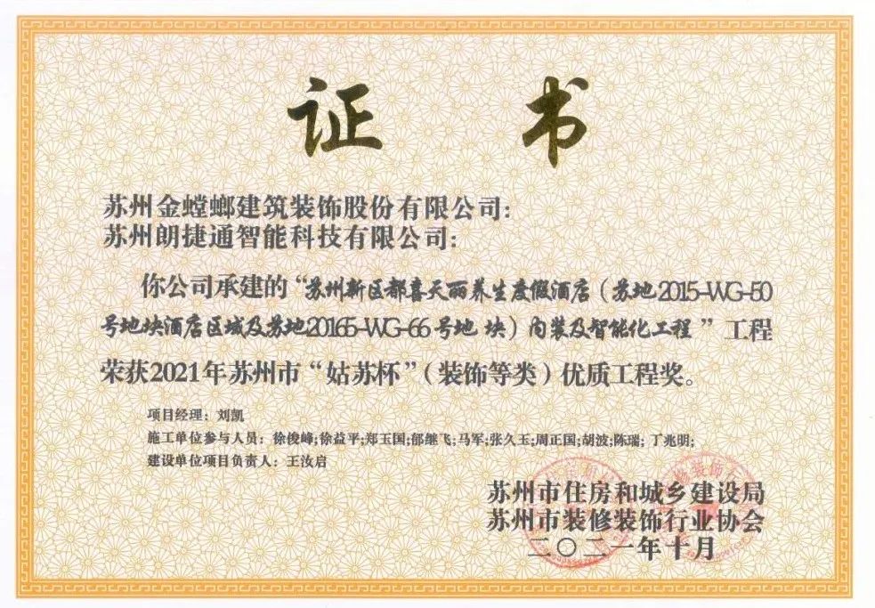 近日,由朗捷通承建的 蘇州新區(qū)都喜天麗養(yǎng)生度假酒店 榮獲2021蘇州市“姑蘇杯”優(yōu)質(zhì)工程獎